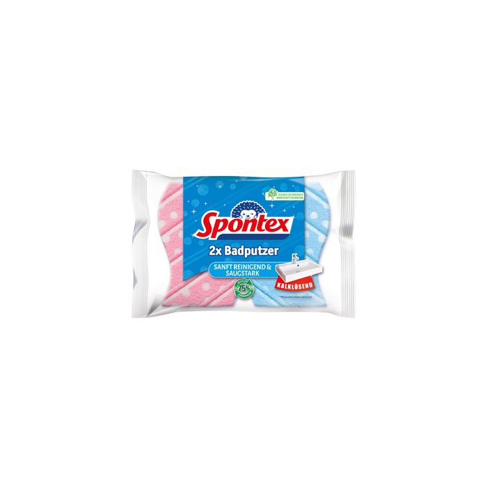 Spontex Éponge à récurer Badputzer, pack de 2 éponge à récurer en viscose spécialement conçue pour la salle de bain, surface abrasive antirayure particulièrement adaptée pour le nettoyage du calcaire, côté absorbant en viscose, couleurs assorties (19321009)