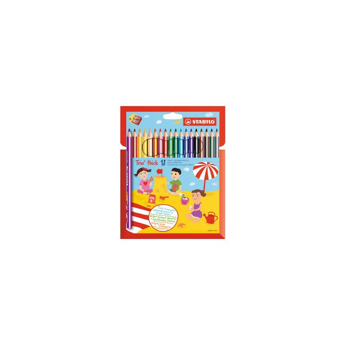 STABILO Crayon de couleur Trio long, corps large, étui de 18triangulaire, taille-crayon double inclus, laqué en couleur,épaisseur de mine: 4,2 mm, longueur: 175 mm, diamètre: 8,8mmcontenu: 18 pièces (203/2-18) assorti dans les couleurs: jaune, orange, rose, marron foncérouge STABILO, vert feuillage, rouge cerise, jaune-orange, rouge-violet, vert, vert jaune, marron clair, noir, couleur chair, bleu violet, bleu outremer, bleu ciel