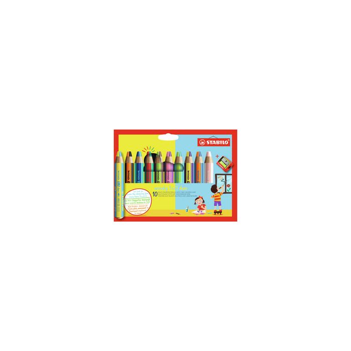 STABILO Crayon multi-talents woody 3 en 1 duo, étui de 10 pointe à 2 couleurs, rond, crayon de couleur/crayon aquarel-lable/craie en un seul crayon, épaisseur de la mine: 10 mm, longueur: 115 mm, mine incassable, contenu : 10 crayons + taille-crayons (882/10-2) colorie aussi les surfaces lisses comme le verre assorti dans les couleurs : jaune/cyan, orange/noir, bleu outremer/turquoise, STABILOrouge/vert foncé, vert clair/marron, rose/bruyère, turquoise/vert clair, jaune/violet, orange/bleu moyen, blanc/abricot