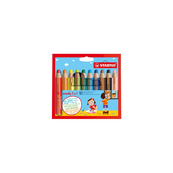 STABILO Crayon multi-talents woody 3 en 1, étui carton de 10rond, crayon de couleur, aquarellable et craie grasse en 1, épaisseur de mine: 10 mm, longueur: 115 mm, mine résistante,taille-crayon inclus, contenu: 10 pièces (880/10-2) écrit également sur les surfaces lisse comme le verre etc. assorti dans les couleurs: jaune, orange, rouge, bleu cyan, vert clair, marron, noir, bruyère, vert foncé, bleu outremer