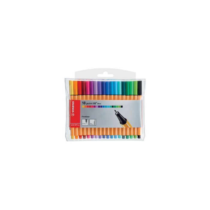 STABILO Feutre à pointe fine point 88 mini, étui plastique de 18, largeur du tracé: 0,4 mm, pointe gainée de métal, capuchon ventilé, bonne résistance au séchage contenu: 18 pièces (688/18-1) assorti dans les couleurs: bleu clair, mauve, vert sapin, rose, vert glacé, vert pomme, rouge, bleu moyen, vert clair,orange, bleu, vert, jaune, noir, lilas, bleu turquoise, violet et rouge foncé