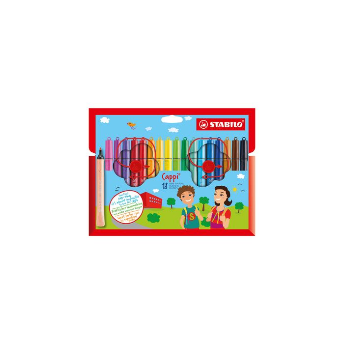 STABILO Feutre Cappi, étui en carton de 18 lacet pour enfiler les capuchons, largeur de tracé: 1,0 mm, en forme de tube, grip ergonomique, encre facile à effacer, capuchon ventilé, peut rester ouvert 24 heures sans sécher, contenu: 18 pièces (168/18-4) assorti dans les couleurs: vert givré, rose, jaune citron, bleu outremer, vert clair, vert émeraude, bleu, jaune, marron, noir, carmin, rouge foncé, orange, violet, bleu azur, lilas, ocre foncé