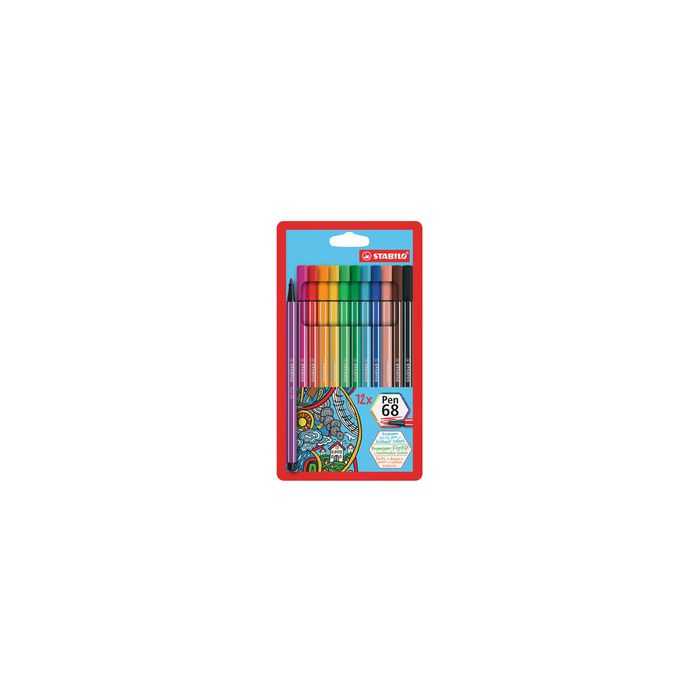 STABILO Feutre Pen 68, étui en carton de 12 largeur de tracé: 1,0 mm, encre inodore à base d'eau, peut rester ouvert 24 heures sans sécher, pointe ogive bloquée contenu: 12 pièces (EO6812-7) assorti dans les couleurs: rose clair, bleu outremer, vert émeraude, vert feuillage, jaune, marron, noir, carmin, orange, rouge rose, bleu azur, lilas