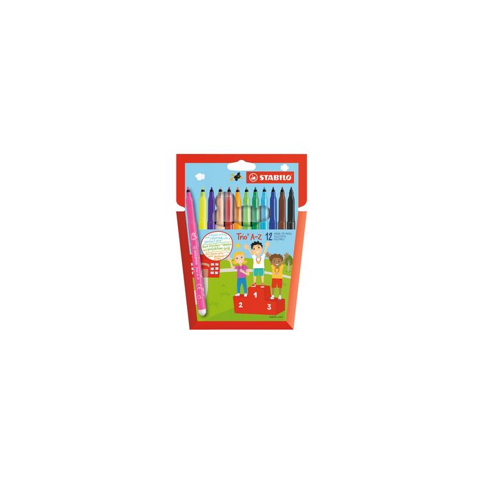 STABILO Feutre Trio A-Z, étui en carton de 12 largeur de tracé: 0,7 mm, zone de préhension triangulaire, capuchon ventilé, lavable, pointe bloquée, corps à la couleur du tracé contenu: 12 pièces (378/1-12-01) assorti dans les couleurs: rouge, orange, vert clair, vert foncé, bleu clair, bleu foncé, lilas, marron, couleur chair,noir, rose fluo, jaune fluo