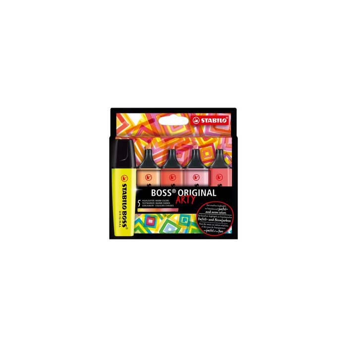 STABILO Surligneur BOSS ORIGINAL, étui carton ARTY de 5 pointe biseautée, largeur tracé: 2,0 - 5,0 mm, peut rester ouvert jusqu'à 4 heures sans sécher, encre à base d'eau, contenu: 5 surligneurs (70/5-02-1-20) couleurs chaudes