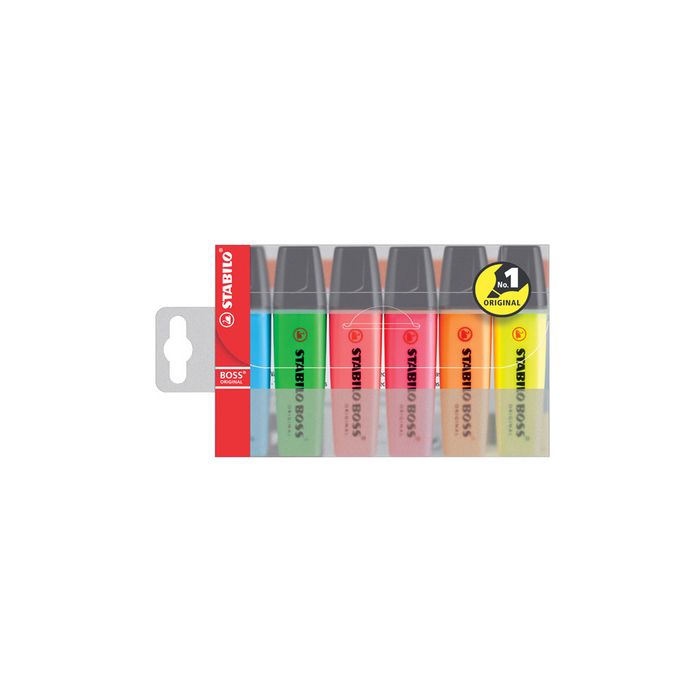 STABILO Surligneur "BOSS ORIGINAL", étui en PET de 6 pointe biseautée, largeur du tracé: 2,0 - 5,0 mm, peut rester ouvert jusqu'à 4 heures, encre rechargeable à base d'eau, assorti en: jaune, bleu, vert, rouge, orange, rose contenu: 6 pièces (70/6)