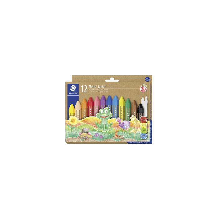 STAEDTLER Craie à la cire Noris junior, étui carton de 12 hexahonal, particulièrement résistant au bris, gaine de pro-tection en papier, diamètre: 14 mm, longueur: 125 mm, assor-ti en jaune, rouge, bleu, bleu clair, orange, apricot, vert,vert jaune, violet, brun, noir, avec racleur (224 C12)