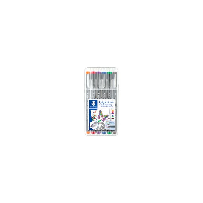 STAEDTLER Feutre à pigment, étui de 6 largeur de tracé: 0,3 mm, longue pointe métallique idéale pour les régles et gabarits, encre à pigment, indélébible, résistante à la lumière et l'eau, clip en métal, contenu: 6 pièces dans un étui STAEDTLER (30803-SSB6) assorti dans les couleurs orange, rouge, violet, bleu, vert et marron
