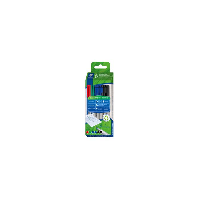 STAEDTLER Marqueur non permanent Lumocolor 316F, étui de 6 corps en plastique recyclé à 97% suivant ISO 14021, largeur de tracé: 0,6 mm, pointe ogive, soluble dans l'eau, rechargeable, avec clip, contenu: 6 feutres dans un étui carton (316 C6-1) corps gris / extrémité du corps & capuchon dans la couleur du tracé, assorti dans les couleurs rouge, vert, 2x bleu, 2x noir