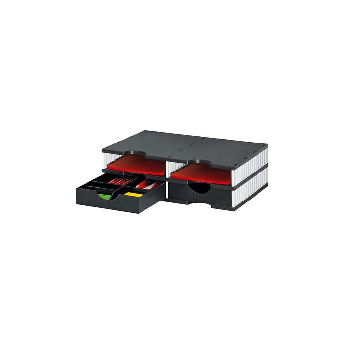 styro Station de classement styrodoc duo, 4 compartiments noir/blanc, station de tri avec 2 casiers et 2 tiroirs, fond/plaque supérieure: noir, parois latérales: blanc, tiroirs: noir, matériau: polystyrène, fourni avec matériel d'étiquetage, dimensions: (L)485 x (P)331 x (H)153 mm (268-0202.0995S ) styrodoc duo Set
