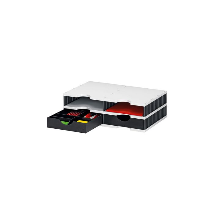 styro Station de classement styrodoc duo, 4 compartiments, gris/noir, station de tri avec 2 casiers et 2 tiroirs, fond/plaque supérieure: gris, parois latérales: noir, tiroirs: noir, matériau: polystyrène, fourni avec matériel d'étiquetage, dimensions: (L)485 x (P)331 x (H)153 mm (268-0202.9895S ) styrodoc duo Set