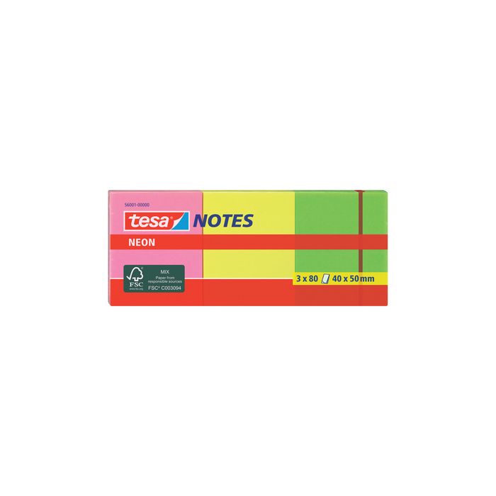 tesa Bloc de notes adhésives couleurs néon, 40 x 50 mm dans les couleurs: rose, jaune, vert, 80 feuilles par bloc, contenu: 3 blocs (56001-00000-00 / 56001-00-00 / 56001-0-0)