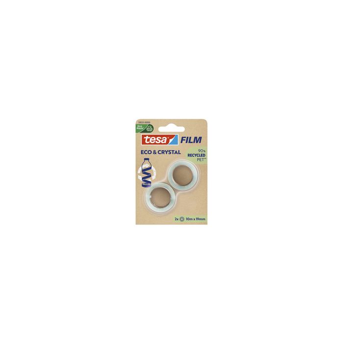tesa Film ruban adhésif ECO & CRYSTAL, 19 mm x 10 m, blistertransparent, film support en plastique fabriqué à 90% avec des bouteilles PET recyclées, entièrement transparent avec une forte adhérence, indéchirable, contenu: 2 rouleaux (59035-00000-00) adapté à tous les dévidoirs tesa film