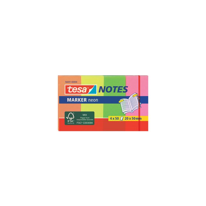 tesa Index repositionnable Marker, couleurs néons,50 x 20 mmpour marquer, inscrire, coller, colle solidement, se détachesans problème, sans solvant, 4 x 50 feuilles de chaque couleur jaune, orange, rose, vert contenu: 4 blocs de 50 feuilles (56691-0-1 / 56691-00000-01)