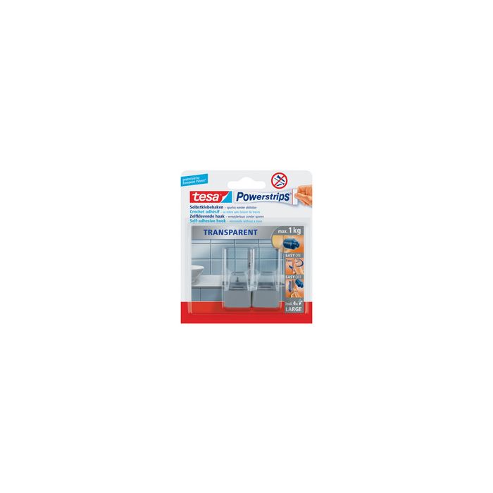 tesa Powerstrips Crochet adhésif LARGE, transparent / chromeen plastique de haute qualité, réutilisable, maintient maximal 1,0 kg contenu: 2 crochets et 4 languettes (58812-00000-20)