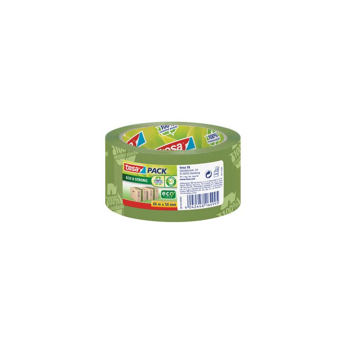 tesa tesapack Ruban adhésif Eco & Strong, 50 mm x 66m imprimé avec le logo "100% recycled plastic", en PP, bobine à 100% en carton recyclé, ruban à 100% en plastique recyclés (PP), couleur: vert (58156-00000-00 / 58156-00-00 / 58156-0-0)