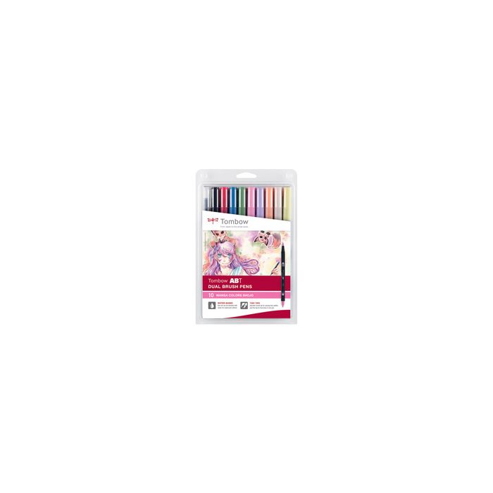 Tombow Feutre double pointe "ABT DUAL BRUSH PEN", set de 10 manga shojo, feutre avec deux pointes: pointe fine pour des lignées précises, pointe pinceau pour le coloriage, encre à base d'eau, couleurs miscibles entre elles contenu: 6 feutres (ABT-10C-MANGA2) sans odeur, largeur de tracé: 0,8-10 mm, assorti dans les couleurs 062, 158, 528, 623, 703, 755, 850, 873, N00, N15