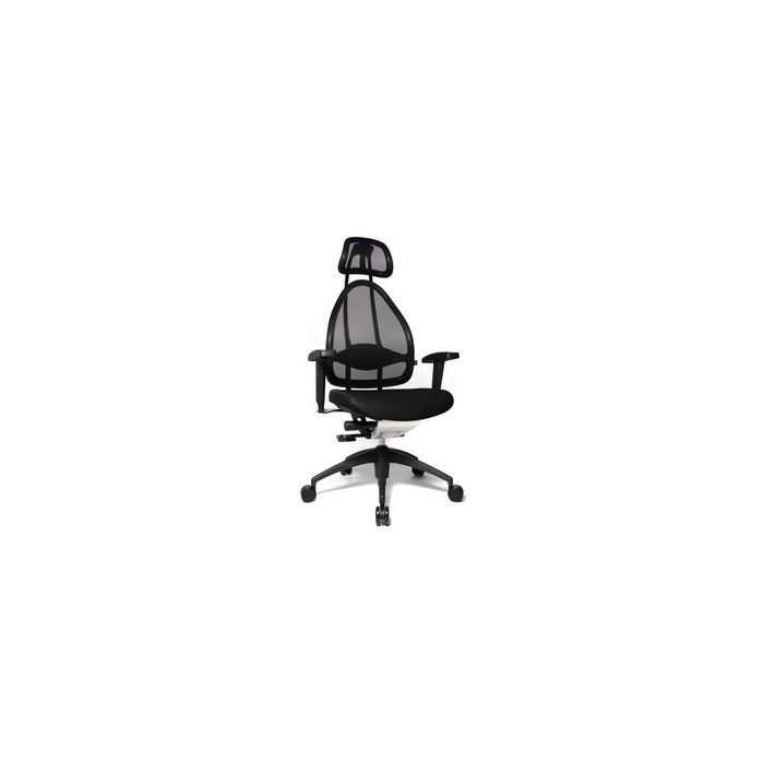 Topstar Chaise de bureau "Open Art 2010", noir pivotante, revêtement: 100% polyester, réglage en continu dela hauteur, appui-tête multifonctionnel, dossier à filet, siège incurvé très confortable, mécanisme synchrone relax, pied en étoile en plastique noir, accoudoirs inclus, (OPA0T B900) capacité de charge : 110 kg, dimensions de l'assise : (L)480 x (P)500 x (H)430 - 520 mm hauteur du dossier : 550 mm roulettes correspondantes pour sol dur : 70699952