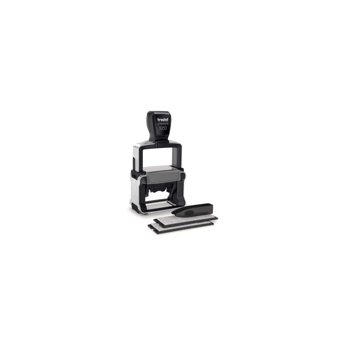 Trodat Tampon à texte Professional 4.0 Typomatic 5253 boîtier: acier inoxydable brossé, couleur tête de préhensionnoir, set de tampon pour installation manuelle, auto-encreur6 lignes, taille de plateau: 49x28 mm, taille d'écriture: 4 mm, tampon de remplacement: 6/50, dimensions: (L)133 x (P)53 x (H)225 mm (5253PR4 /120253)