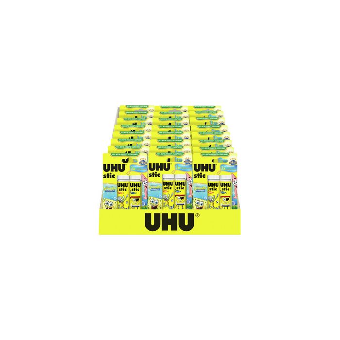 UHU Bâton de colle stic Bob l'éponge, 2 x 21 g, présentoir bâton de colle aux motifs Bob l'éponge, sans solvant, capuchon à vis, facilement lavable, 98% de composants d'origine naturelle contenu: 24 cartes blister de 2 bâtons de 21 g (7008666/9000625)