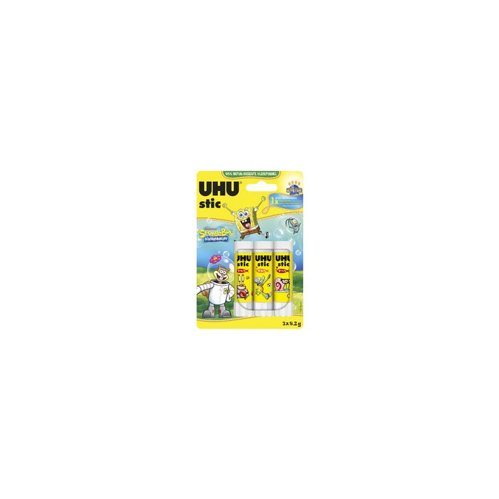 UHU Bâton de colle stic Bob l'éponge, 3 x 8,2 g, blister bâton de colle aux motifs Bob l'éponge, sans solvant, capuchon à vis, facilement lavable, 98% de composants d'origine naturelle contenu: 3 bâtons de colle de 8,2 g (9000622)