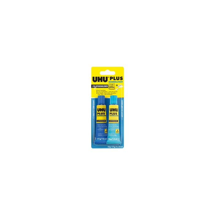 UHU Colle à 2 composants plus adhérence rapide, tube de 35 gà base de résine époxyde, sans solvant, résistance finale: 1.900 N/qcm, dosage liant et durcisseur: même proportion 1:1, pâte transparente une fois sec, collagerésilient et résistant au vieillissement et (45700) à l'action de l'humidité