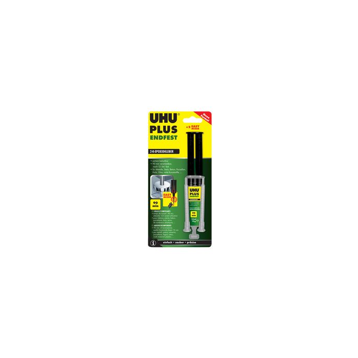 UHU Colle à 2 composants plus endfest, seringue à double chambre, à base de résine époxyde, sans solvant, temps de traitement: 90 minutes, le temps de durcissement et la résistance finale sont dépendantes de la température, contenu: 15 g (45650) liason résistante aux chocs, au vieillissement et à l'humidité, liant: durcisseur = volume 1:1