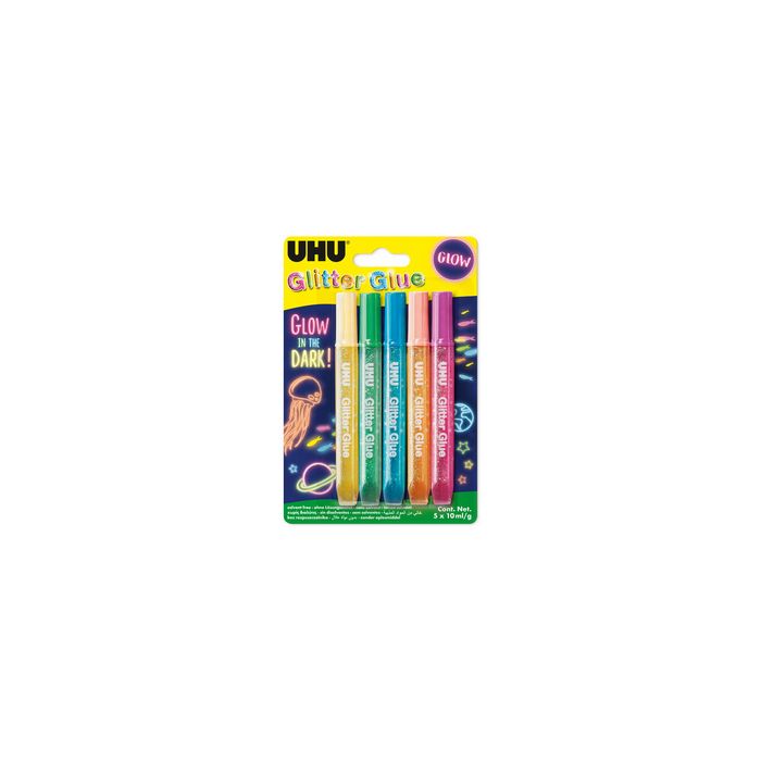 UHU Colle à paillettes Glitter Glue "GLOW IN THE DARK" 5 x 10 ml, sans solvant, plaisir créatif pailleté qui brilledans l'obscurité, tube extra souple avec pointe de dosage fin, testé dermatologiquement, assorti dans les couleurs jaune, vert, bleu, orange, violette, sur carte blister (48210)