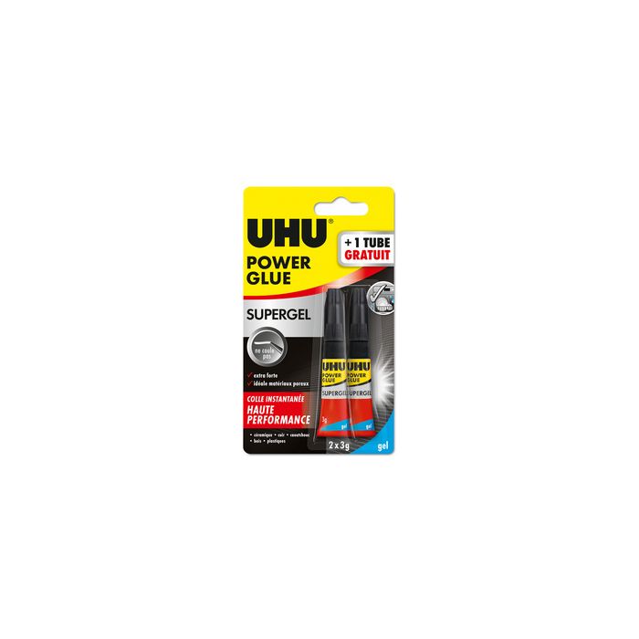 UHU Colle instantanée POWER GLUE ultra rapide SUPERGEL, 3 g avec solvant, dans un tube, ne coule pas, idéal pour les matériaux poreux, ainsi que la plupart des matériaux: métal,caoutchouc, cuir, bois, verre,.. sous blister contenu: 1 tube + 1 tube GRATUIT (36735)