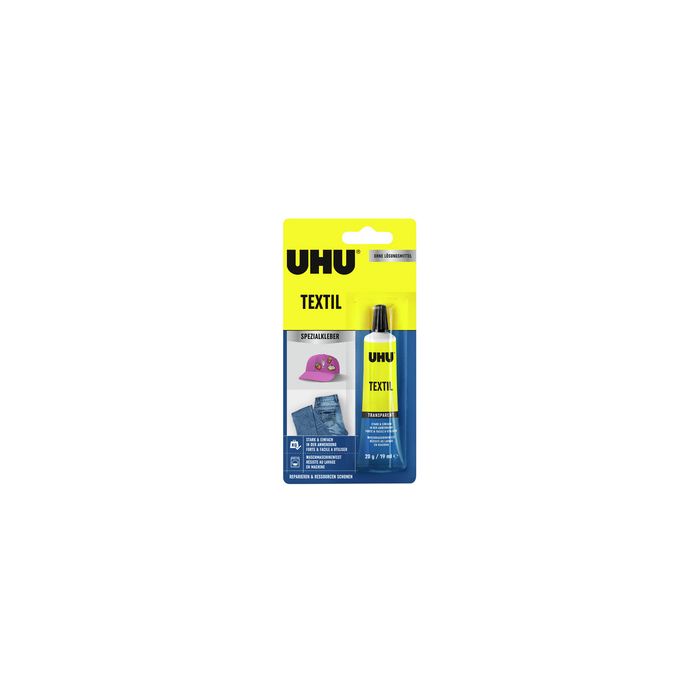 UHU Colle spéciale pour textiles, sans solvant, tube de 20 gcolle à prise rapide, résiste au lavage & nettoyage, la collure reste élastique, sèche en 30 min env., transparente & flexible après séchage, convient pour différents tissus, sur carte blister (48665)