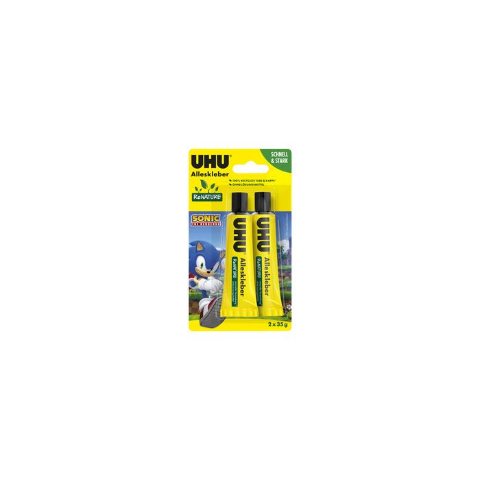 UHU Colle universelle ReNATURE SONIC, sans solvant, 2x 35 g transparent, sèche rapidement, résiste à l'eau, inodore, retouchable, sur carte blister au motif SONIC contenu: 2 x 35 g (9000361/7006396)