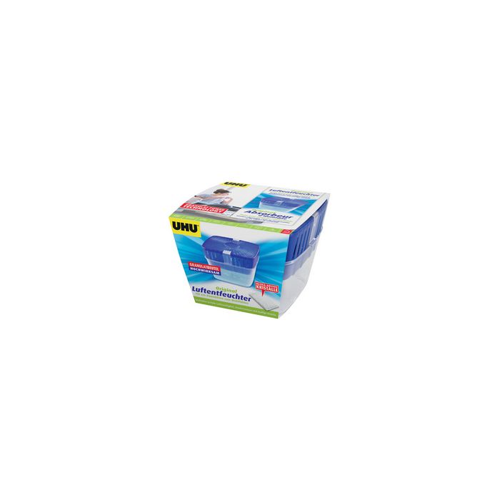 UHU Déshumidificateur, pour les pièces jusqu'à 45 m3, contenu: 450 g, élimine le surplus d'humidité de la pièce, prévient corrosion,moisi, tâches de moisissure et les odeursde renfermé, autorégulateur, protection brevetée contre les éclaboussures et affichage du niveau de remplissage, avec bouchon égouttoir (nouveau: 52155 / ancien: 47130) rechargeable