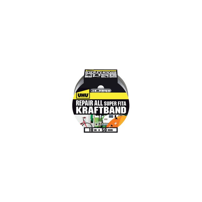 UHU Ruban adhésif blindé Repair all, (l)50 mm x (L)10 m, argenté, ruban adhésif trés résistant avec revêtement en polyester, pour réparer, emballer, boucher, relier et renforcer de façon étanche, pour l'intérieur et l'extérieur,inscriptible,déchirable à la main,forte adhésion sur presquetoutes les surfaces, pierre,bois,béton,plastique etc.(48145) ruban adhésif de réparation