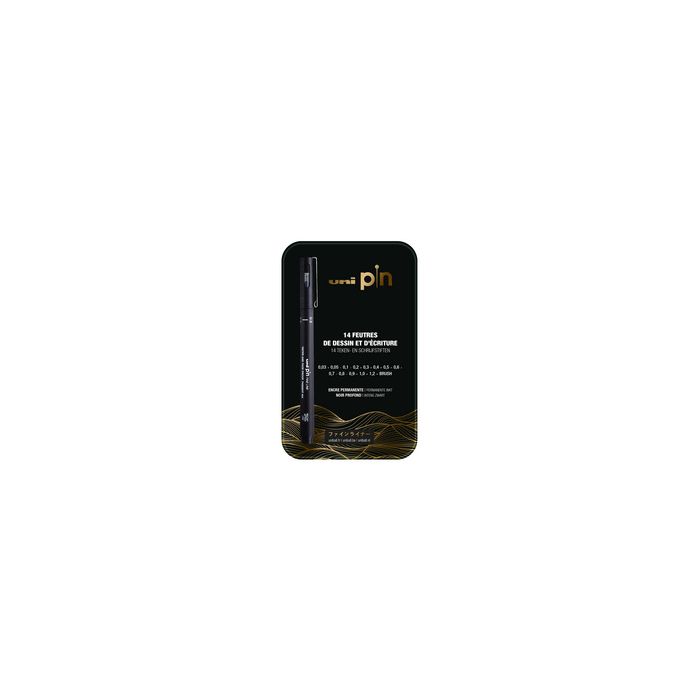uni-ball Feutre technique uni pin, étui métal de 14 pièces contenu: 13 feutres uni pin pointe calibrée, 1 feutre uni pin pointe pinceau, feutres assortis dans différentes largeurs de tracé de 0,03 mm à 1,2 mm (BOITE PIN/14 001)