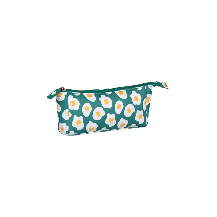 WEDO Trousse "Oeuf sur le plat", en polyester, couleur: vert/blanc/jaune, motif oeufs sur le plat blancs etjaunes sur fond vert, 2 compartiments spacieux, poche zippée séparée, 4 passants pour stylo élastiques, avec languette, dimensions: (L)195 x (P)45 x (H)90 mm (24245304)